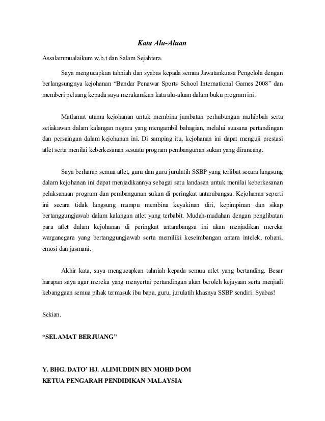 Kata alu-aluan format ceramah hendaklah diberikan Konsep dan prinsip pelajar cemerlang mengapa pelajar harus cemerlang gambaran kecemerlangan peribahasa. Ucapan alu-aluan Assalamualaikum wrt wbrkth salam sejahtera salam satu Malaysia dan salam Perak Aman Jaya. Perkara-perkara penting yang disebut oleh pengerusi perlu direkodkan dan diminitkan.